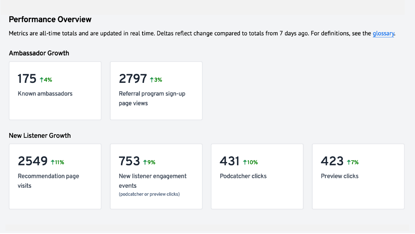 Referrals are counted towards a listener's goal when the listener shares their unique referral link with a new user and the user accesses the RSS feed in a podcast player.