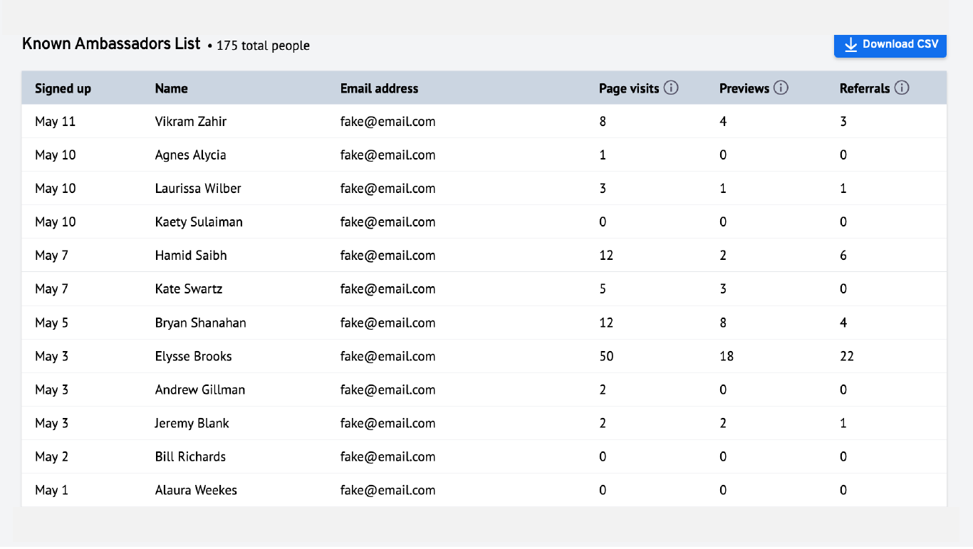 Up-to-date CSV of your referrers that includes key information to help you send rewards, import referrers to your newsletter, and keep track of your growth. You’ll see your referrers’ names, email addresses, their number of referrals, and unique referral links.
