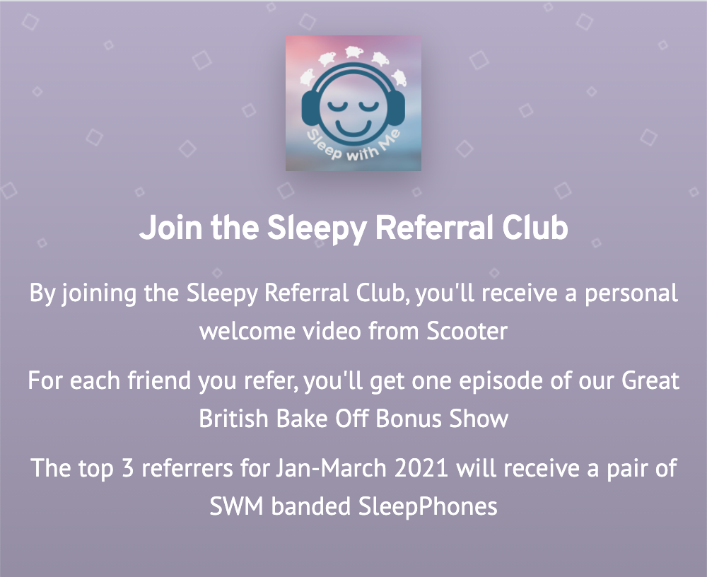 Check out Sleep With Me's referral program, the Sleepy Referral Club: