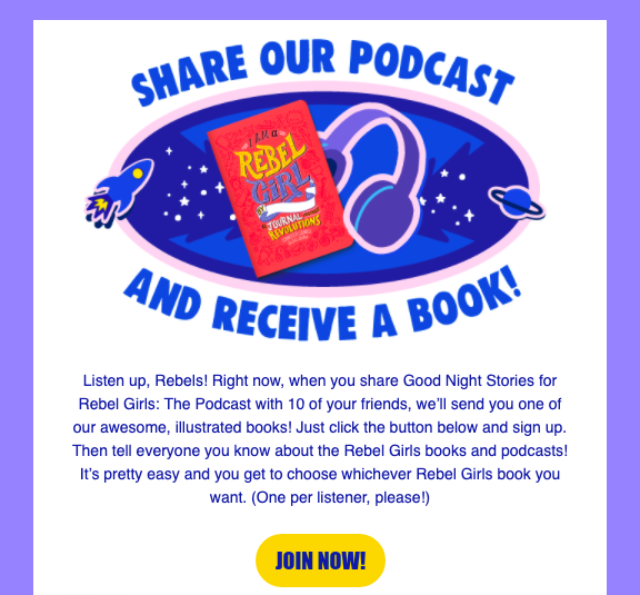Add a reward tier for signing up to share. Lowering the bar of entry for earning recognition tends to drive more listeners to take action. We’ve found that lowering the bar of referrals to attract more listeners to sign up increases referrals in the long run.