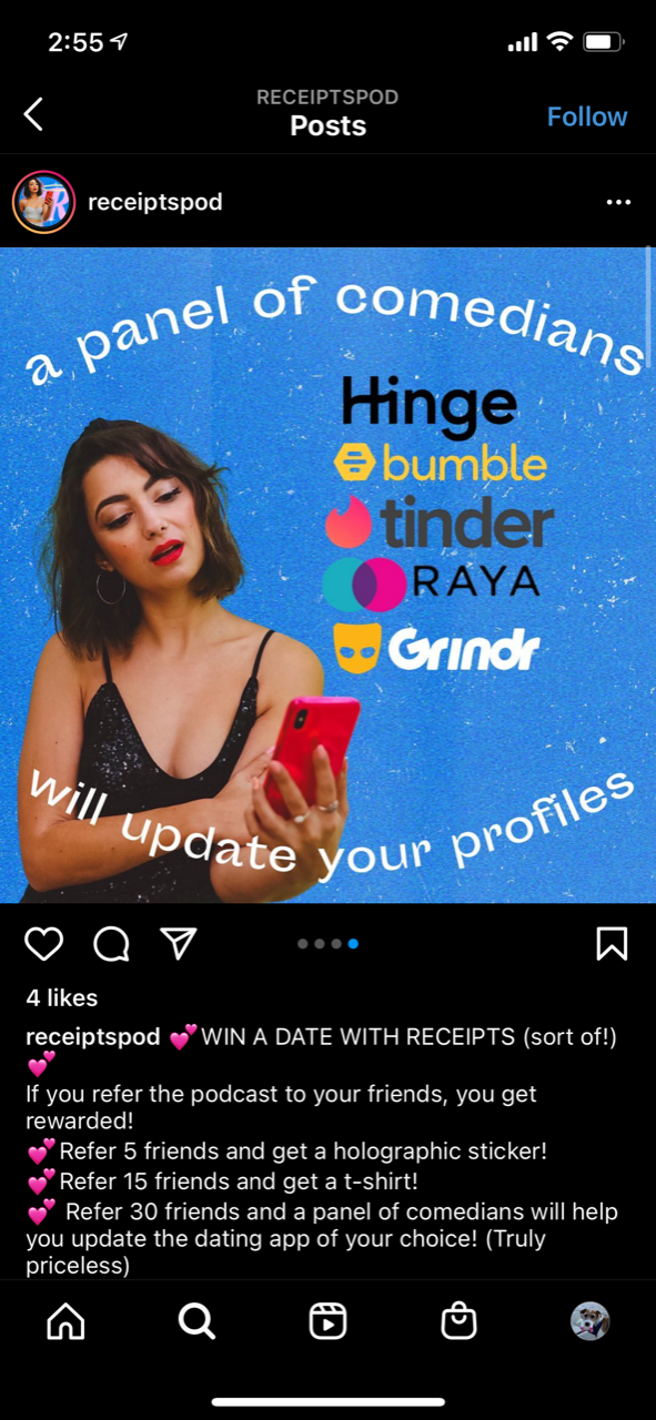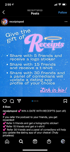 Refer this episode of Receipts to your friends and win prizes! Share with 3 friends and get a shoutout, 5 friends and get a sticker, 15 friends and get a t-shirt, and for the top referrer each month, a panel of comedians will UPDATE YOUR DATING APP PROFILE (priceless!!). It takes less than a minute to sign-up.
